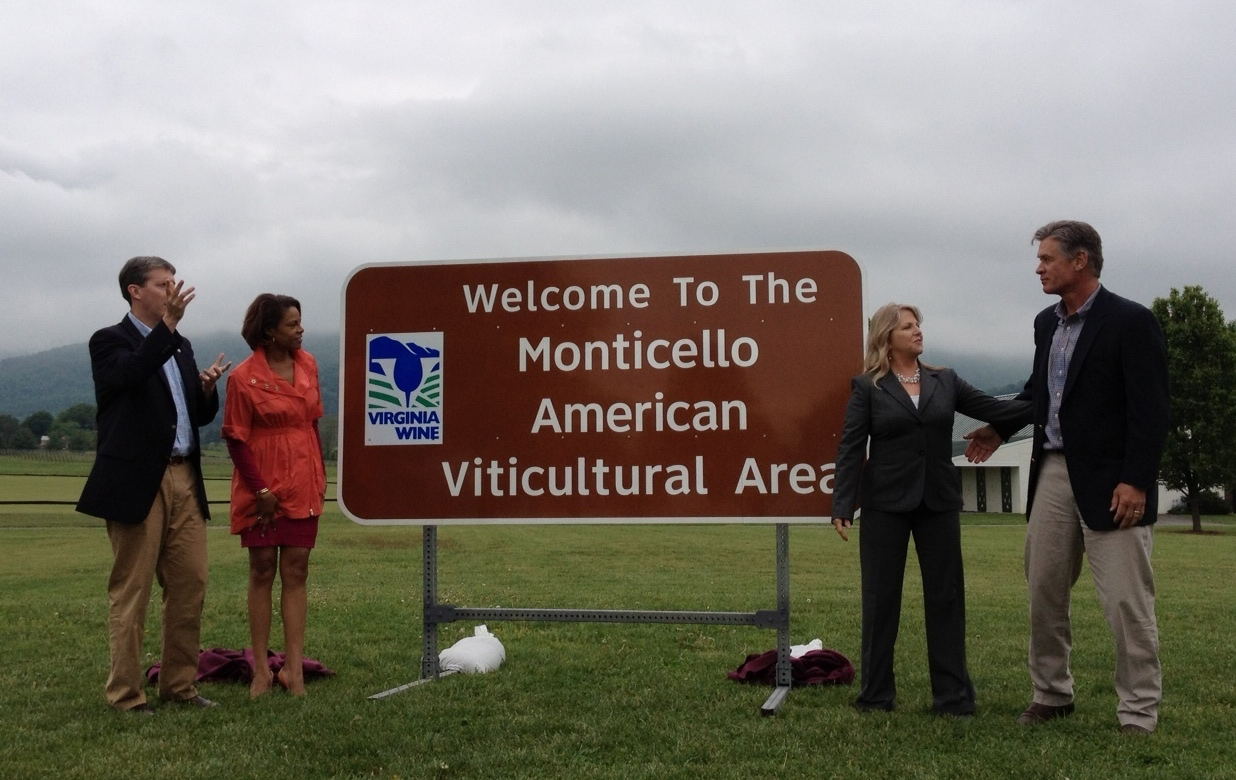 The first sign was unveiled earlier today in the Monticello AVA at King Family Vineyards in Crozet by First Lady Maureen McDonnell, Secretary of Agriculture and Forestry Todd Haymore, Interim Virginia Tourism Corporation Director Rita McClenny, and David King, co-owner of King Family Vineyards and a member of the Virginia Wine Board. As one of Virginia’s oldest AVA’s, Monticello is now home to 40 wineries. Throughout the spring and summer, signs will be placed at key points of entry in the Eastern Shore AVA, Northern Neck-George Washington Birthplace AVA, Shenandoah AVA and the Northern Virginia Wine Region.