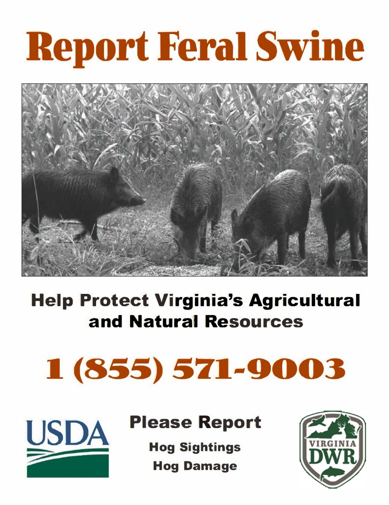 As farmers know, feral hogs can be detrimental to crops, pastures, and infrastructure, as well as a serious risk for the spread of disease to livestock. Wildlife agencies, in cooperation with various stakeholders across the commonwealth, have managed to suppress the population in Virginia, but there is still work to be done to achieve eradication. Farmers who see feral hogs or experience hog damage are encouraged to contact the Wildlife Conflict Helpline at 1 (855-571-9003).