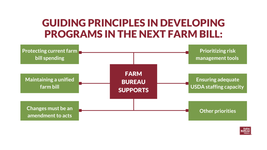 The AFBF farm bill working group, which includes Virginia staff, continues to assess the 2018 U.S. Farm Bill to determine what is working, what is not working and how the legislative package could be improved to address the economic and market conditions on the horizon. Farm Bureau supports the following principles to guide development of programs in the next farm bill: