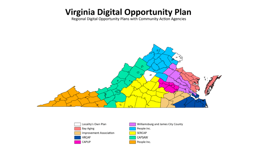DHCD is partnering with the Department of Social Services, the Virginia Community Action Partnership, and Community Action Agencies to develop Regional Digital Opportunity Plans. Across nine regions, Community Action Agencies are assessing the digital divide through stakeholder engagement, survey distribution and data analysis and community input sessions to develop regional plans that address identified community needs related to the digital divide. The nine regions, as well as the lead Community Action Agency for each regional plan, are listed in the map.