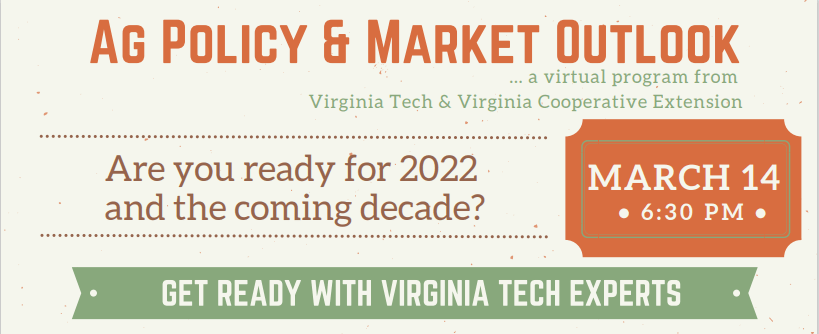 Are you ready for 2022 and the coming decade? Virginia Tech and Virginia Cooperative Extension is offering a virtual program on March 14 at 6:30 p.m. to help you prepare your agriculture business. Experts from Virginia Tech will cover: